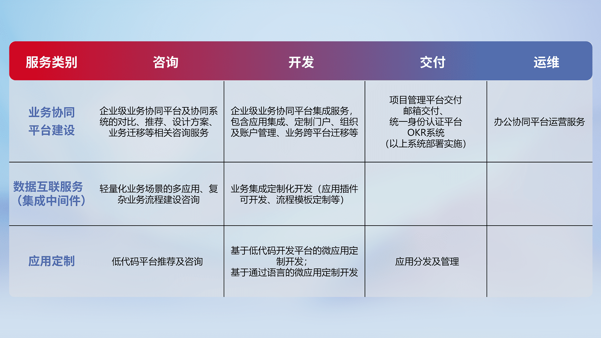 针对钉钉、、、、企微、、、IDaas等平台级产品提供产品的规划、、、、方案、、交付、、、、定制化开发等服务,,,,实现如统一协同办公、、智能客户服务、、、、混合会议管理、、、、智能数据查询、、、、等业务场景,,,实现数字化转型。。。。