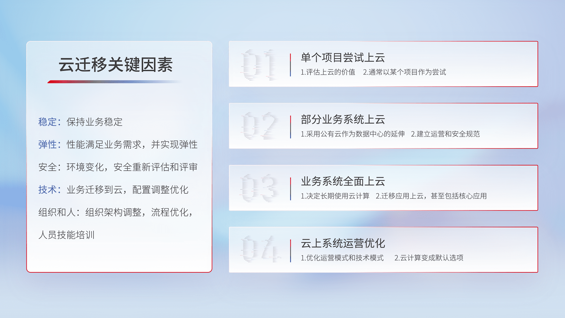 结合实际业务,,从规划设计、、云平台选型、、、云原生改造、、、、数据迁移、、集成交付,,迁移全过程为客户识别最佳上云路径,,,做好风险识别管理,,,,设计网络架构、、身份权限、、、安全审计合规、、操作审计、、、、日志审计、、、、监控告警策略、、多站点容灾设计等,,对云上基础设施进行整体规划,,,提升IT治理水平,,,以满足弹性、、高可用、、、、高性能的需求。。。